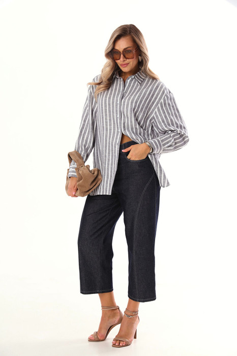 Брюки капри, зауженные и укороченные к низу, выполнены из джинсовой ткани. По переду и сзади расположены карманы. Застежка на пуговицу и молнию.