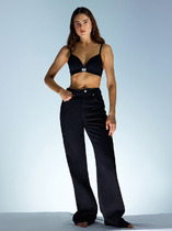 Брюки из джинса, прилегающего силуэта, слегка расклешенные к низу. Средняя посадка, пояс притачной, застежка спереди на молнию и пуговицу. По переду боковые карманы, вертикальные швы заканчиваются вставкой из кружева, сзади под кокеткой накладные карманы с кружевной отделкой.