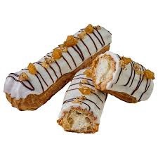 Пирожное из нежного заварного теста со сливочно-сырным кремом и карамелизированной грушей, декорированное глазурью, грецким орехом и кусочками груши.