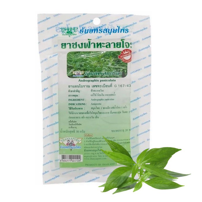 Лечебный чай с концентратом Андрографис, более известного как Фа Талай Джон обладает выраженными противовирусным и иммуностимулирующим эффектами.Имеет схожее с антибиотиками действие, однако не наносит ущерб здоровью и не губит микрофлору организма. Используется как жаропонижающее и антибактериальное средство.Его рекомендуют пить во время простуды, гриппа, ОРВИ или в качестве профилактического средства.Настой обладает характерным травяным вкусом и подходит для регулярного применения.Свойства чая Фа Талай Джон (Andrographis paniculata):