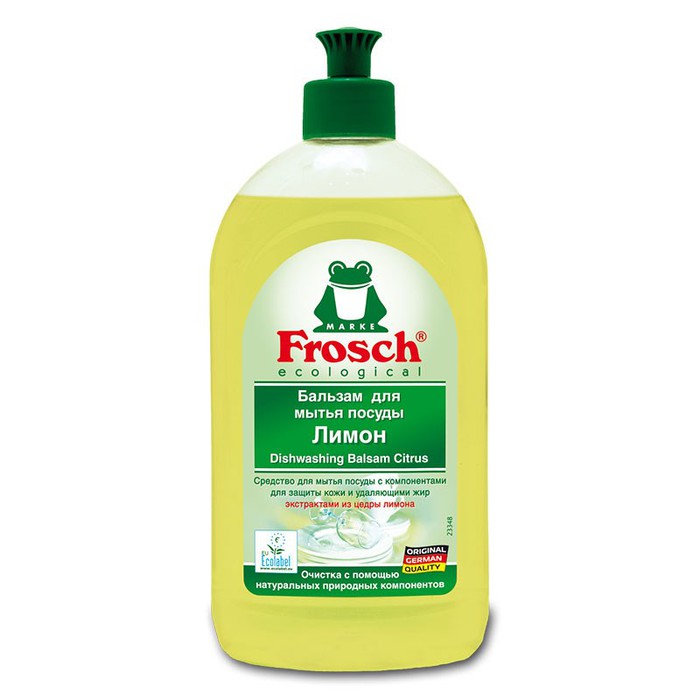 Средство для мытья посуды Frosch Лимон растворяет жир и способствует самовысыханию посуды.