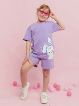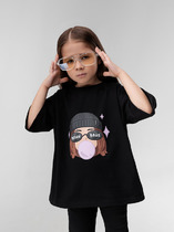 Футболка детская из гладкокрашеного трикотажного полотна "кулирка", модного силуэта, слегка укороченная, свободного покроя, с приспущенным плечом, втачными рукавами длиной до локтя, горловиной овальной формы, обработанной втачной планкой и принтом в центре переда. По шву втачивания планки настрочена отделочная строчка. Низ изделия и нижние срезы рукавов обработаны швом вподгибку.