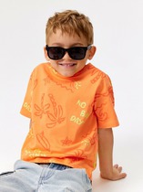 Футболка оверсайз для мальчика из трикотажного полотна: хлопкового с добавлением лайкры. Модель с принтом на переде, спущенной линией плеч, рукавами длиной до локтя.