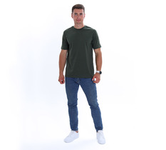Базовая однотонная мужская футболка прямого силуэта без принта. Выполнена из трикотажного полотна: хлопкового с добавлением лайкры. Горловина округлой формы с усилителем горловины спинки.