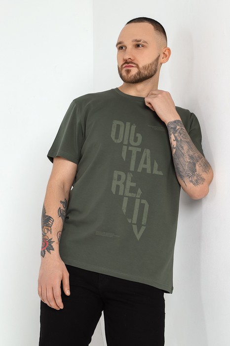 Футболка мужская из гладкокрашеного трикотажного полотна "кулирка" с лайкрой, классическогоь покроя, с коротким втачными рукавами, горловиной овальной формы, обработанной втачной планкой и принтом на полочке, выполненным в технике шелкографии.