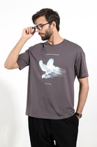 Футболка мужская с короткими рукавами, удлиненными плечевыми швами, горловиной овальной формы, обработанной втачной планкой и принтом на детали переда, выполненным в технике шелкографии. По шву втачивания планки в горловину настрочена отделочная строчка. Нижние срезы руквов и изделия обработаны швом вподгибку.
