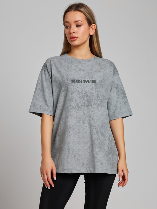 Футболка женская из трикотажного полотна "кулирка-варенка", с удлиненными плечевыми швами, втачными короткими рукавами, горловиной овальной формы, обработанной втачной планкой, и принтом на детали переда, выполненным в технике шелкографии. По горловине изделия настрочена отделочная строчка.