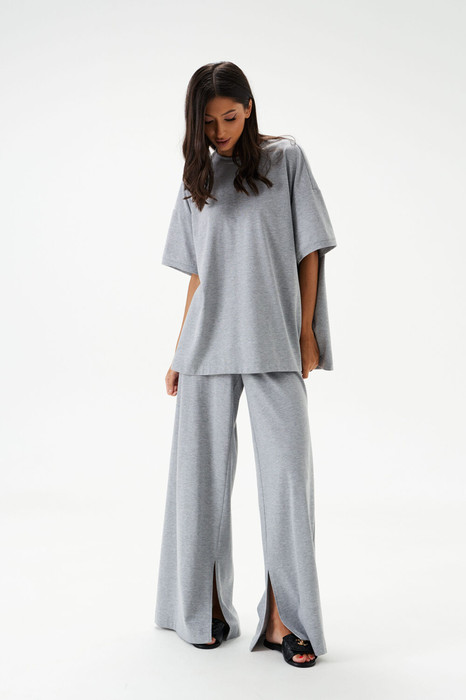 Футболка прямого свободного кроя. Выполнена из хлопкового полотна серого цвета. Вырез горловины круглый. Рукав втачной, спущенный. Длина рукава от линии втачивания 17 см. Длина спинки 71 см