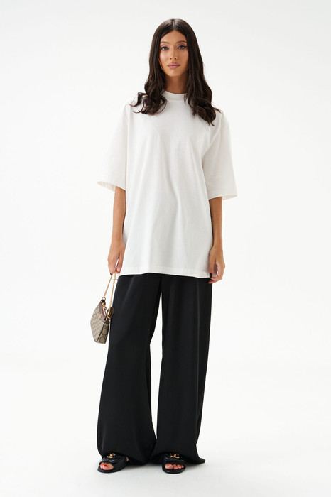 Футболка прямого свободного кроя. Выполнена из хлопкового полотна тёплого белого цвета. Вырез горловины круглый. Рукав втачной, спущенный. Длина рукава от линии втачивания 30 см. Длина спинки 78 см