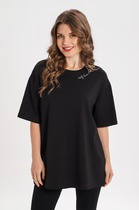 Футболка из хлопковой кулирки, умеренный оверсайз, со спущенным плечом и коротким рукавом. Вырез горловиныкруглый, с необработанной бейкой. Перед декорирован авторским принтом и эффектными прорезями.