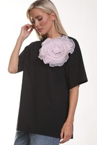 Футболка из хлопковой кулирки с "мраморным" принтом, свободного силуэта, с коротким рукавом и круглой горловиной. Перед и спинка со средними швами налицо. На переде накладной карман. Изделие декорировано авторскими принтами и эффектными прорезями.