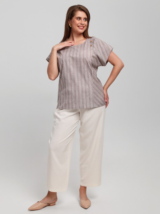 Футболка - женская из трикотажного полотна «кулирка» с набивным рисунком в полоску, с цельнокроеными рукавами, горловиной овальной формы, окантованной основным материалом. Деталь полочки состоит из двух частей, одна из которых с ассиметричным направлением рисунка. В плечевом шве заложена складка, дополненная декоративными пуговицами.