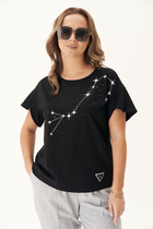 Базовые футболки - это конечно хорошо, но что делать, если хочется привнести в образ яркости, иронии и немного артистизма? Лучший способ выразить себя - выбрать вариант с классным "говорящим" принтом. Футболка классического кроя со спущенным плечом. Длина футболки около 60 см. Длина рукава около 15 см.