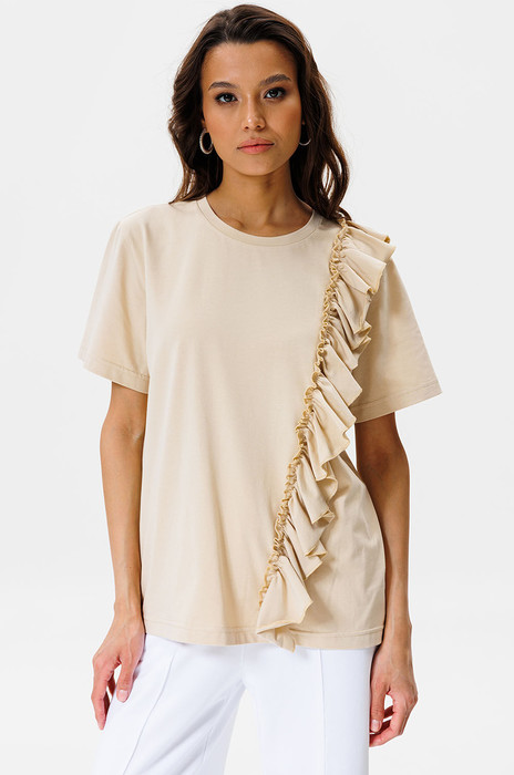 В этой футболке с воланом от GOwear вы не останетесь незамеченной! Вы легко сможете собрать много стильных образов с вашими юбками, шортами, жакетами и брюками!