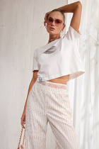 Футболка женская из гладкокрашенного трикотажного полотна «кулирка с лайкрой», свободного покроя, со спущенным плечом и втачными рукавами длиной до локтя, горловиной овальной формы, обработанной втачной планкой, на полочке выполнена печать в технике «шелкографии». В нижней части боковых швов – разрезы.