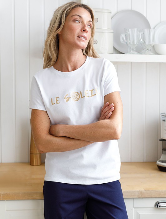 Состав: 100%Хлопок Плотность: 140 Г/м2Перевод принта: "le soleil (фр.) - солнце". Футболка прямого кроя выполнена из 100% хлопка. Базовая модель дополнена лаконичным авторским принтом. Легко впишется в повседневный гардероб. Изделие хорошо держит форму и обеспечивает комфортный микроклимат в течение дня.