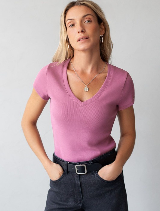 Футболка из плотного трикотажа в рубчик с V-образным вырезом