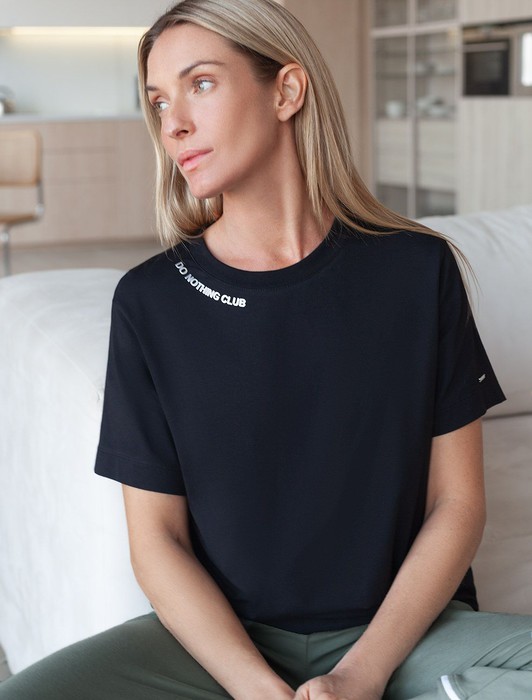 Состав: 92%Хлопок 8%ПУ Плотность: 170 Г/м2 Параметры модели на первом фото: Рост 172, бюст 88, талия 64, бедра 88Перевод принта: Do nothing club - клуб любителей отдыха. Футболка выполнена из премиального хлопка. Авторский принт нанесен фактурными красками с устойчивым покрытием. Наличие эластана в составе гарантирует комфорт и формоустойчивость. Изделие дополнено фирменным металлическим логотипом бренда.