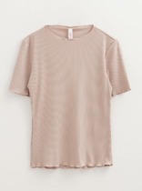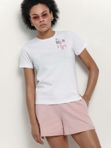 Лаконичная женская футболка, по типу топа с цельнокроеным коротким рукавом. Модель полупримталенного силуэта с нагрудными выточками и разрезами по бокам. Вырез горловины округлый, окантован. По лифу размещена термо-печать.