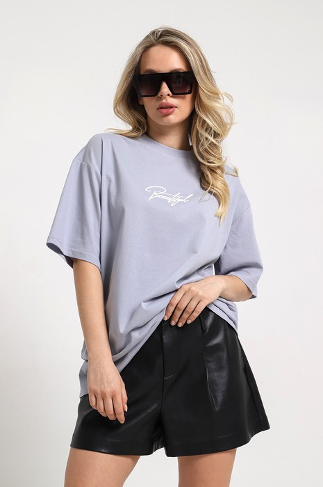 Футболка молодежная из гладкокрашенного полотна «кулирка» свободного покроя, со спущенной линией плеча, широкой подгибкой низа изделия и рукавов, горловиной овальной формы, обработанной втачной планкой, принтом на полочке, выполненным в технике «шелкографии».