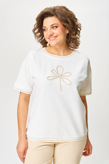 Джемпер женский из трикотажной хлопковой ткани (двунитка). По переду футболки расположен декоративный элемент из тесьмы. Спущенное плечо. Низ рукава, низ изделия и вырез горловины обработаны отделочной тесьмой. Спинка без среднего шва.