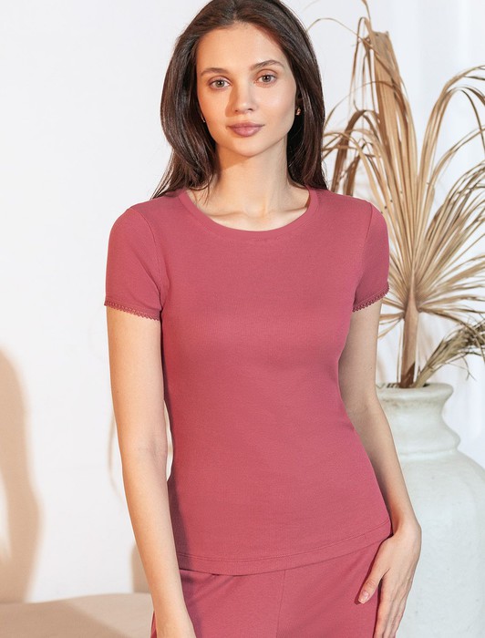 Состав: 95%Хлопок 5%ПУ Плотность: 150 Г/м2Футболка темно-кораллового цвета с круглым вырезом из из фактурного трикотажа в рубчик идеально сочетается с повседневным стилем и подходит для домашней носки или отдыха. Мягкое полотно из хлопка обеспечивает максимальный комфорт даже в течение длительного времени. Особенность этого изделия — эластичная структура ткани, благодаря чему она хорошо тянется и подстраивается под особенности фигуры. Короткие рукава делают модель легкой и универсальной. На рукавах отделка нежным кружевом в тон основного цвета добавляет нотку романтичности. Футболка подойдет для девушек и женщин, которые ценят уют и удобство. Нежная ткань приятна к телу, не вызывает дискомфорта и позволяет коже дышать, что особенно важно в повседневной жизни. Футболка в мелкий рубчик полуприлегающего кроя визуально вытягивает силуэт и делает фигуру более стройной. Разнообразие размеров позволяет выбрать подходящий вариант для любых параметров, в том числе на большие размеры. Эта красивая футболка практична и незаменима для тех, кто ищет качественные и стильные вещи на каждый день.