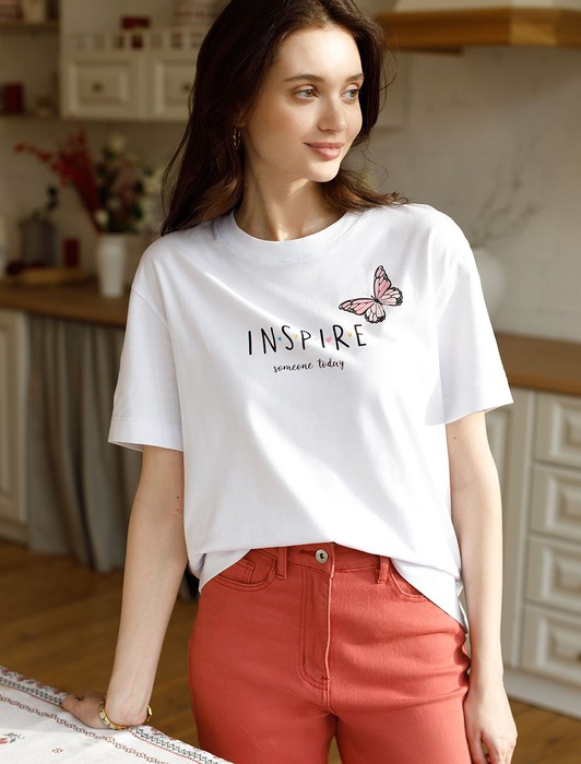 Особое внимание привлекает стильный принт в виде бабочки с минималистичной надписью, перевод надписи Inspire Someone Today - Вдохновите кого-нибудь сегодня . Принт выполненны красками с устойчивым покрытием, который добавляет изделию оригинальности и позволяет выразить индивидуальность.