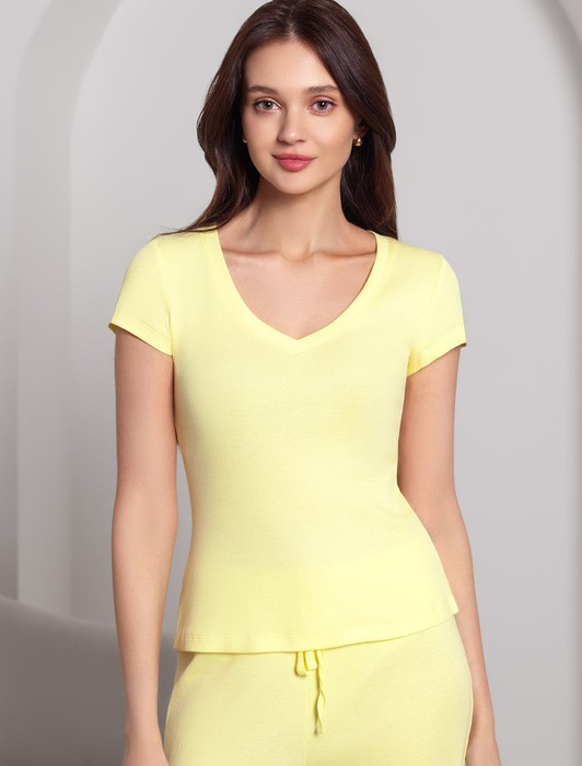 Состав: 95%Хлопок 5%ПУ Плотность: 150 Г/м2Футболка лимонного цвета с V вырезом из фактурного трикотажа в рубчик. Особенность полотна - трикотаж кашкорсе удивительной мягкости, намного мягче стандартных вариантов, подходящий для расслабленных домашних и пижамных образов. Хлопок обеспечивает максимальный комфорт даже в течение длительного времени и позволяет коже дышать, а эластан в составе позволяет ткани подстраиваться под особенности фигуры. Короткие рукава делают модель легкой и универсальной. V-образный вырез красиво подчеркивает зону декольте, придавая образу утонченность и женственность, не открывая лишнего, сохраняя при этом комфорт и уверенность в себе. Футболка подойдет для девушек и женщин, которые ценят уют и удобство. Футболка в мелкий рубчик полуприлегающего кроя визуально вытягивает силуэт и делает фигуру более стройной. Разнообразие размеров позволяет выбрать подходящий вариант для любых параметров, в том числе на большие размеры. Эта красивая футболка практична и незаменима для тех, кто ищет качественные и стильные вещи на каждый день.