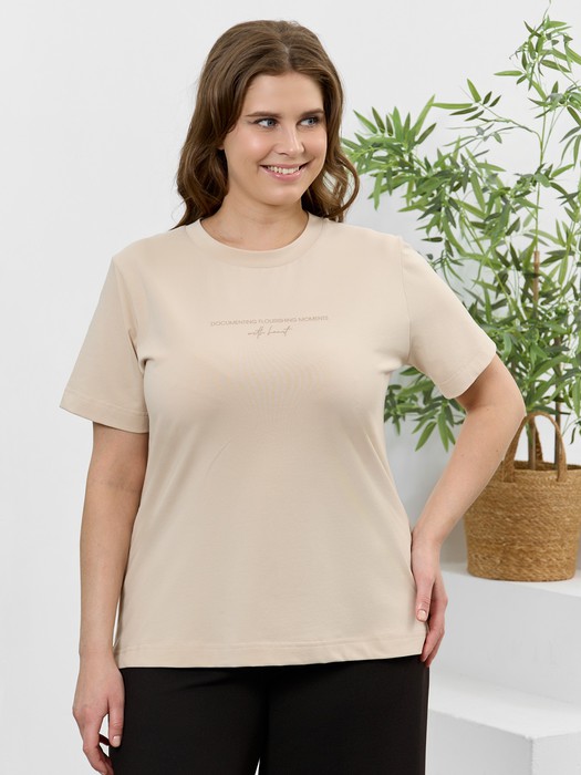 Футболка женская из гладкокрашеного трикотажного полотна «кулирка с лайкрой», полуприталенного силуэта, с втачными короткими рукавами. На полочке выполнена печать в технике «шелкографии». Горловина овальной формы обработана втачной планкой с отделочной строчкой по шву притачивания.
