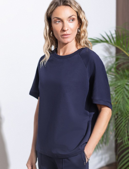 Состав: 95%Хлопок 5%ПУ Плотность: 240 Г/м2Футболка темно-синего цвета свободного кроя выполнена из премиального футера двухнитки с эластаном плотностью 240 Г/м2. . Натуральный материал отличается мягкостью и приятной текстурой, позволяя коже дышать и обеспечивая максимальное удобство при носке. Наличие эластана в составе изделия гарантирует абсолютный комфорт и формоустойчивость. Круглый ворот, рукава регланы средней длины и спущенная линия плеча придают футболке стильный и современный вид, делают образ расслабленным и непринужденным, такой вариант отлично сядет на большие размеры. Плотная футболка идеально подходит для повседневной носки и незаменима для тех, кто ценит удобство и свободу движений без компромиссов по стилю.