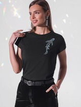 Стильная базовая футболка черного цвета с серебристым принтом фольгой выполнена из плотного хлопка с эластаном для комфортной посадки на любую фигуру. Прямая футболка классического кроя с круглым вырезом, прекрасно подходит для разных типов фигуры, в том числе и на большие размеры. Мягкость хлопка вместе с небольшой долей эластана гарантирует идеальную посадку и свободу движений. Легкая натуральная дышащая ткань премиального качества делает футболку с коротким рукавом идеальным вариантом для повседневной носки дома, на работу или офис. Однотонная футболка дополнена авторским аккуратным принтом с изображением леопарда, который придает праздничный и элегантный вид без лишней вычурности. Блестящий анималистичный принт аккуратно украшает, добавляя изысканный акцент и создавая легкий мерцающий эффект.