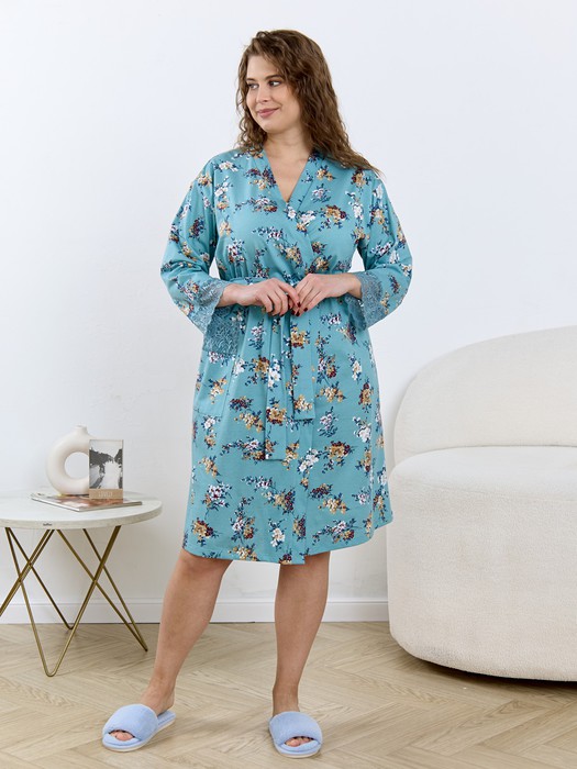 Халат женский из трикотажного полотна «кулирка» с набивным рисунком, на запахе, с втачными длинными рукавами, съемным поясам, продетым в две шлевки, вставленные в боковые швы на уровне линии талии. На правой полочке на уровне бедер – накладной карман прямоугольной формы. Борта и горловина обработаны притачной планкой. Верхний срез кармана и нижние срезы рукавов отделаны кружевом.