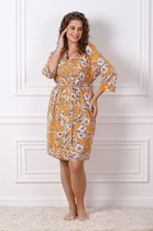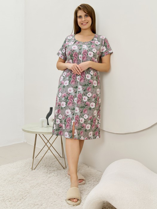 Халат женский из гладкокрашенного трикотажно полотна «кулирка» с набивным рисунком, полуприталенного силуэта, с короткими рукавами покроя «реглан» и горловиной овальной формы, окантованной основным материалом, с центральной бортовой застежкой на тесьму «молния». По срезу горловины выполнены неглубокие складки, нижние резы рукавов обработаны притачными манжетами с кантом контрастного цвета.