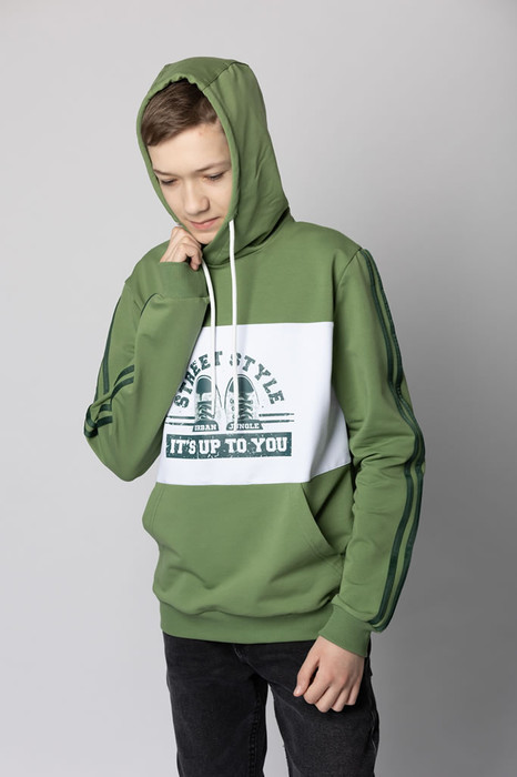 Худи для подростков. Состав: Футер 2-х ниточный, 75% хлопок, 20%  полиэстер, 5%  лайкра. Особенности: Принт на вставке передней половинки; Капюшон внахлёст; Накладной карман-кенгуру. Таблица размеров и ростов Размер 36 38 40 42 44 Обхват груди, см 64-66 68-70 72-74 76-78 80-82 Рост, см 134-140 140-146 146-152 152-158 158-164