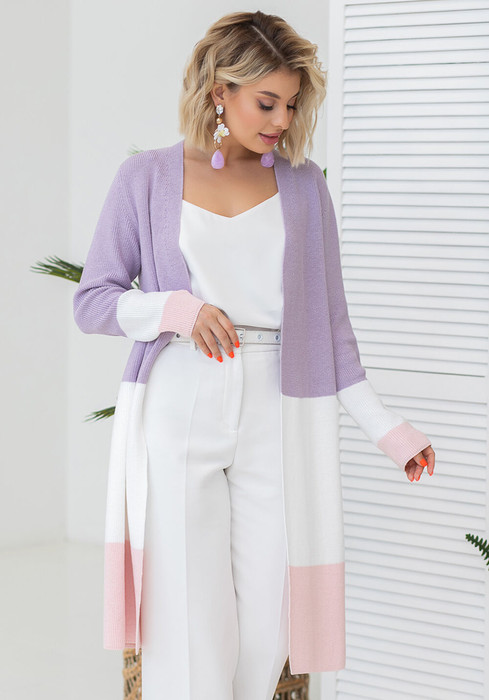Женский вязаный летний, легкий, теплый кардиган трёхцветный длинный до колена. Вырез горловины V-образный. Линия борта центральная, без застёжки. Рукав втачной прямого покроя. Отличная кофта на осень. Стильный, оригинальный в полоску. Состав: хлопок и акрил, поэтому имеет высокие гигиенические показатели, очень приятен к телу (не колется), теплый и хорошо держит форму. Цветовые решения модели позволяют выбрать изделие как для офиса, повседневный так и праздничный. Используемые цвета в пряже позволят подобрать любой образ женщине, девушке для любого случая в жизни. Кардиган на весну.