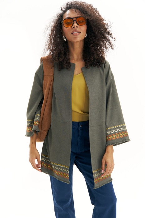 Рукава втачные одношовные со спущенной линией проймы, длиной 3/4. Низ изделия и низ рукавов с бахромой и вышивкой. По проймам, среднему шву спинки, подрезам переда, горловине и краям борта расположена отделочная строчка шириной 0,5.