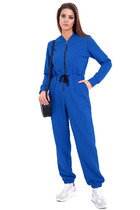 Комбинезон полуприлегающего силуэта, на передних частях обработаны нагрудные вытачки и клапаны, потайная застежка планка на петли и пуговицы, спинка с кокеткой, по центру складка на свободу движения.