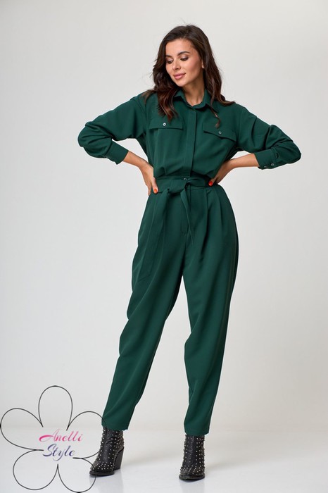 Комбинезон из костюмной ткани создает стильный образ как для каждого дня так и для выхода в свет. Комбинезон полуприлегающего силуэта, на передних частях обработаны нагрудные вытачки и клапаны, потайная застежка-планка на петли и пуговицы, спинка с кокеткой, по центру складка на свободу движения. Нижняя часть комбинезона выполнена на широком поясе, по переду заложены складки, застежка «гульфик». Обработаны боковые карманы, на задних частях обработаны талиевые вытачки и клапаны. Воротник рубашечного типа, на стойке. Рукава втачные, длинные, на притачной манжете, с застежкой на петли и пуговицы. В комплекте съемный пояс из основной ткани.