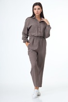 Комбинезон полуприлегающего силуэта, на передних частях обработаны нагрудные вытачки и клапаны, потайная застежка планка на петли и пуговицы, спинка с кокеткой, по центру складка на свободу движения.