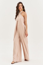 Комбинезон полуприлегающего силуэта, отрезной по линии талии. Верх комбинезона с двубортной застежкой, которая фиксируется на талии на кнопки. Линия плеча спущенная. Рукав втачной, одношёвный, заканчивающийся манжетой с застежкой на кнопки. Вырез горловины V-образный, с асимметричным воротником, пиджачного типа, по правой правой половинке. Спинка со средним швом и талиевыми вытачками. Перед со складками по талии. Нижняя часть комбинезона в виде брюк, зауженных к низу, заканчивающихся цельнокроеной манжетой, что позволяет регулировать длину. По переду карманы, складки по талии. Нижняя часть с застежкой - молнией. В комплекте бандо, из трикотажного полотна, брошь. Декоративные элементы могут отличаться от фото.