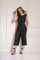 Комбинезон женский летний свободного кроя с широкими укороченными брюками. По переду изделие отрезное по линии талии. На брючинах имеются карманы( накладной с клапаном и в боковом шве). По спинке изделия расположены накладные клапаны. комбинезон без застежки. Изделие дополнены съемным поясом.