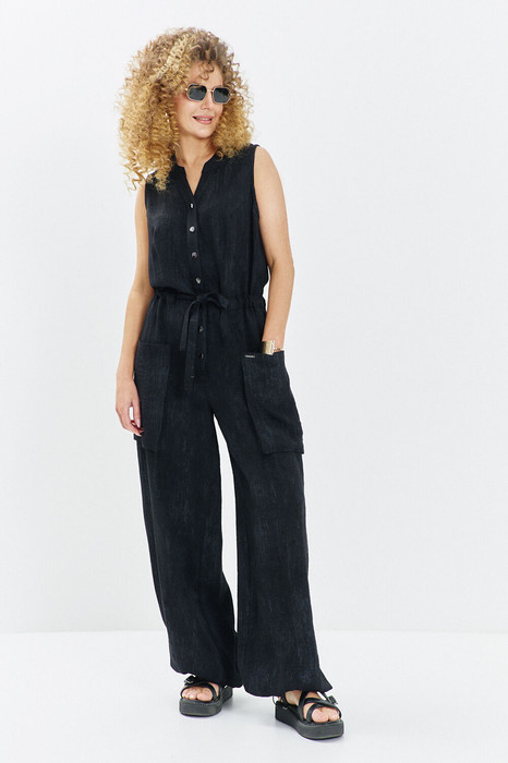 Комбинезон летний свободного кроя , оверсайз не сковывает движений, создавая вокруг вас облако легкости. Акцентная планка с застежкой на кнопки по всей длине переда визуально вытягивает рост, добавляя образу стройности и динамики. Горловина - округлая с плосколежащей стойкой.