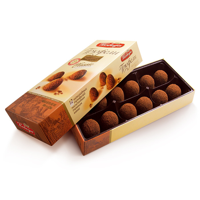 Классические трюфели «Победа» созданы по традиционному рецепту. Нежное «сердце» из сливок и шоколада усыпано ароматным темным какао. Трюфель – это шоколадный «король», премиальный продукт с богатой историей, восходящей к французскому кондитерскому искусству 19 века. Эти конфеты обладают удивительной способностью мгновенно создавать вокруг себя атмосферу праздника.