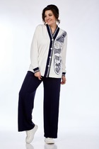 Костюм женский из кулирного полотна состоит из футболки и брюк. Футболка прямой силуэт. Горловина круглая, рукав короткий, втачной, низ изделия обработан на плоскошовной машине. Брюки прямые, верх на поясе с резинкой, в боковых швах внутренние карманы, низ изделия с манжетом. На полочке и передней половине брюк принт.