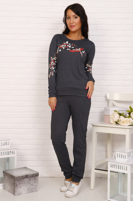 Костюм женский из кулирного полотна состоит из кофты и брюк. Кофта - горловина круглая, обработана окантовкой, рукав длинный, втачной, низ на манжете, низ изделия на поясе, на полочке и рукавах принт. Брюки прямые, верх на поясе с резинкой, в боковых швах внутренние карманы, низ изделия на манжете.