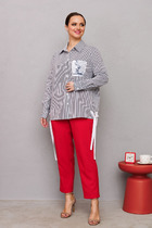 Костюм женский из кулирного полотна состоит из кофты и брюк. Кофта приталенный силуэт, верх на кокетке, горловина круглая, рукав спущенный, короткий, на полочке принт. Брюки прямые, верх на поясе с резинкой, в боковых швах лампасы и карманы в цвет отделки. Низ обработан на плоскошовной машине.
