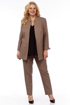 Костюм женский из кулирного полотна состоит из кофты и брюк. Кофта прямой силуэт, горловина круглая, по центру планка с застежкой на петли-пуговицы, рукав втачной 3/4, низ обработан на плоскошовной машине, на полочке принт. Брюки прямые, верх на поясе с резинкой, в боковых швах карманы, низ брюк на манжете.