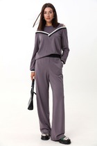 Женский костюм - толстовка свободного силуэта, V-образный вырез декорирован серебристой тесьмой. Брюки на резинке, низ с подворотом.