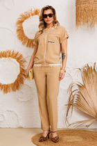 Костюм женский из кулирного полотна, состоит из кофты и брюк. Кофта - прямой силуэт, горловина круглая. Рукав длинный, втачной, внизу на манжете. Низ изделия на поясе. Брюки прямые, верх на поясе с резинкой, в боковых швах внутренние карманы. Низ изделия на манжете. На полочке принт.