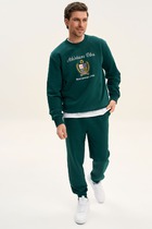 Мужской костюм из 2-х нитки с лайкрой. Толстовка с капюшоном, пояс из кашкорсе, карманы "кенгуру". На рукавах вставки с печатью. Брюки на манжетах, два кармана с листочкой. По боковым швам вставки с печатью. Пояс из кашкорсе с резинкой и шнурком.